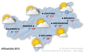 Su gran parte del territorio il tempo sarà soleggiato con cielo poco nuvoloso. Sulla cresta di confine ci saranno annuvolamenti più consistenti con dei rovesci nevosi a tratti tra il Brennero ed il Passo Stalle. Nelle vallate soffierà ancora il Föhn da nord a tratti con forte intensità. Temperature massime tra 11° in Alta Val d'Isarco e 20° in Bassa Atesina.